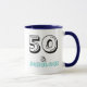 Celebrate a 50th birthday and birth year with this 50 & Fabulous Coffee mug. It has dark blue handles and is dark blue inside, with text in black and turquoise blue, on a white background. The text says "50 & Fabulous". It's a nice 50th birthday design to celebrate turning 50! Give it as a gift or get it for yourself. Some options can be personalised / customised.