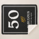 50 and fabulous with name and date field birthday sherpa blanket. Black with gold and white text within a white border.