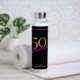 Celebrate turning 50 in style! This elegant 50th birthday water bottle features gold typography and accents as well as chic hot pink script on a black background. Customise it by adding your (or her) name to it.