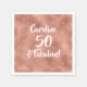 Paper party napkins that celebrate milestone birthdays with a flair. "50 (name/age/year can be customised) and fabulous" in modern brush stroke white text on copper and hearts background.