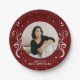 50 and Fabulous Foliage Red 50th Birthday Photo Paper Plates. Personalised 50th birthday photo party plates. 50 and fabulous text in trendy white script with a name and white foliage on a dark red background. Personalise it with your name, age and photo.