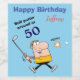 This personalised wine bottle label is a fun gift for a golfer who is turning the big 50. It features your custom text in red, blue, and black stylised text. Currently it says "Still puttin' around at 50". A cartoon golfer is taking a whack at his ball beside the text. Add your birthday message and name. The image and text are placed on a bright blue background. *This design uses image © Graphics Factory.com*