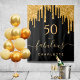 A trendy and glamourous 50th birthday tapestry. A classic black background decorated with faux gold glitter drips, paint dripping look. With the text: 50 and fabulous. Personalise and add a name. Golden coloured text. The word Fabulous is written with a modern hand lettered style script with swashes. Can be used as a welcome banner, party wall decor or as a fotobooth backdrop.