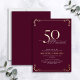 This beautiful invitation features hand lettered calligraphy artfully presenting 'fifty' in luxurious hand lettering against a burgundy background, adorned with delicate swirls in the corners top and bottom in real gold foil, along with the name and the number 50. This image will have all your guests excitedly anticipating your fabulous fiftieth festivities!