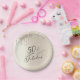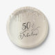 Girly and chic 50th birthday party paper plates featuring "50 & Fabulous" written in stylish elegant script against a champagne gold faux foil background, with gold faux glitter dripping from the top.