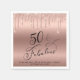 Elegant and chic personalised 50th birthday party napkins featuring "50 & Fabulous" written in a stylish script against a rose gold faux foil background, with rose gold faux glitter dripping from the top. You can personalise with her name and date of the party.