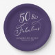 Chic purple 50th birthday party paper plates featuring "50 & Fabulous" showcased in an elegant white calligraphy script. Personalise with your name and party date in simple modern lettering.
