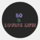 Celebrate turning 50 with this customisable sticker. Customise or choose a different styled sticker. 50 & Loving Life statement with purple 50 number, pinkish 'Loving Life' text and green and symbol. Customise or choose different colours and choose a different background colour rather than black