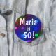 A festive colourful button pin with a background bokeh of colourful party lights and the text says: "Maria is 50!" Change to any name and any age easily. Easy to customise this cute badge and personalise with any age or name, etc. A happy and fun button pin for kids, teens, and men and women of any age from babies, kids, teens to those special birthday milestone over the hill ages!