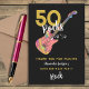 Cool pink guitar, gold and black 50 Rocks 50th birthday party thank you card. Cool detailed funky colourful electric guitar with pink pick guard a unique illustration with personalised white and gold modern typography. Easy to use template to personalise and create the perfect party thank you card for the milestone fifty in rock n roll style. Ideal for a rockstar wife, girlfriend, friend or partners rock and roll party thank you especially for a guitarist, musician and music lover. Original artwork by artist Catherine Sweetman