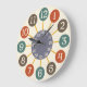 This fun clock design is inspired by retro 1950s atomic clocks. The beige numbers are in circles of various vintage shades of orange, brown and teal blue. They spider outward from a round centre in a grey hue that counts the seconds / minutes. It's a simple, bold modern mid-century design with a masculine feel. It all rests on an antique beige background, but you can customise that shade to any you like so the clock better matches your home decor.