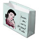 Large glossy mint gift bag with an image of a brunette 50s woman with her finger on her chin as if poised to express a thought. Customisable text. See the entire Nifty 50s Gift Bag collection in the PARTY FAVORS section.