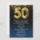 Gold mylar balloons with confetti stars on gradient blue and black for 50th wedding anniversary.