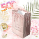 A gift bag for a feminine and glamorous 50th birthday. A rose gold background with rose gold drips, paint drip look. The text: The name is written in dark rose gold with a modern hand lettered style script. Tempate for a date and age 50.