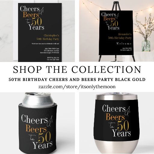 50th Birthday Cheers and Beers Party Black GoldDesigned by Only The Moon