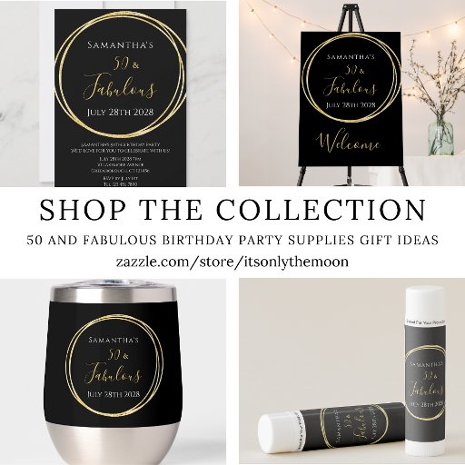 This is a chic and elegant 50th birthday party design. This stylish design is in classic black and gold. It has the text, "Samantha is 50 and Fabulous" and the celebration date. This simple, modern, typography motif is framed by an elegant gold foil circle. The text, "50 and Fabulous" is also in gold foil. This stylish design is perfect for a chic and unforgettable 50th birthday party celebration. To personalise, simply add your name and date in the personalise this text box. To change the colour or font, check out the design editing tool. If you need help with personalisation, or for a custom design contact me via zazzle chat or email: ursuladawnmoon@gmail.com