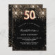 A modern, stylish and glamorous invitation for a 50th birthday party. A black background decorated with faux glitter. The name is written with a modern golden colored hand lettered style script. Personalize and add your party details. Number 50 is written with a balloon style font, script.