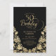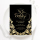 Black gold elegant 50th birthday party invitation. Classy design featuring roses, faux gold foil and typography script font. Trendy invite card perfect for a stylish female bday celebration. Personalise with your own details. Can be customised to any age. Printed Zazzle invitations or instant download digital printable template.