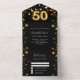 A black background, decorated with golden stars and a large number 50 in faux gold. Personalise and add a name, party details, RSVP date, return address and name.