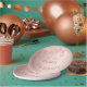A paper plate for a girly and glamourous 50th birthday party. A rose gold background with drips, paint drip look. The text: The name is written in dark rose gold with a large modern hand lettered style script. Template for name, age 50 and a date.