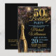 A stylish 50th Birthday Party Invitation featuring a bottle of bubbly in gold, fireworks with gold and blue text all on a black background . A gorgeous invitation to send to family and friends to celebrate a special birthday. All text can be amended as needed - more text can be added on the back or delete the text box if need needed.