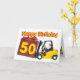 A forklift holds a parcel with the age on it in bright yellow letters. A cheery and funny birthday card for a man.