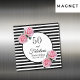 A magnet for a 50th birthday party. Classic slim black and white horizontal stripes as background. With girly and feminine pink roses as decoration.
