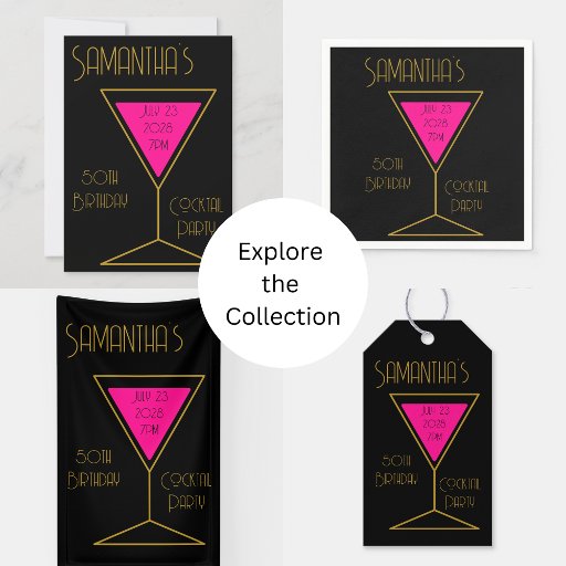 This is a chic and stylish 50th birthday design with a Cocktail Party theme. This elegant art deco inspired design design is in trending black and gold with hot pink accents and stylish typography. This vintage art deco / 1920s, Cocktail themed design is perfect for a stylish, fun, and unforgettable 50th birthday party or celebration. To personalise, simply add your name, and celebration date in the personalise this text box. You can also change the text here if you want to. To change the colour or font, check out the design editing tool. If you need help with personalisation, matching products, or for a custom design contact me via zazzle chat or email: ursuladawnmoon@gmail.com