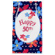 Orange, red, and blue daisy flowers on polka dot pattern for 50th birthday.