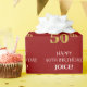 This luxurious and elegant birthday-themed wrapping paper design features the message "HAPPY 50th BIRTHDAY,", a customisable name, and the birthday number "50th" having a faux/imitation gold inspired appearance pattern. The background is coloured red. Wrapping paper like this might be used when preparing gifts or presents to be given in celebration of somebody’s 50th birthday. [~Z0000491]