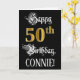 The front of this fancy and formal birthday themed greeting card design features the message “Happy 50th Birthday,”, plus a customisable recipient name. Some of the message is in an elegant script-style text, the large number “50th” features a faux/imitation gold-inspired look pattern, and the background is coloured black. The inside has a customised birthday greeting message, or could perhaps be cleared and left blank if a message is to be written by hand instead. A luxurious, personalised birthday greeting card like this might be used to acknowledge somebody’s fiftieth birthday. [~Z0000559]