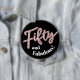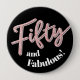Fifty and fabulous, 50th birthday half century glitter style effect fifty script text in rose pink and silver hues with with text on black pin button badge.  Other years and matching items are available. © Original design by Sarah Trett for www.mylittleeden.com on Zazzle.