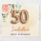 For an elegant and feminine 50th birthday birthday party. A golden watercolored background. Decorated with a rose gold and blush pink watercolored rose flower, floral, green eucalyptus leaves, sprigs, greenery and faux gold sprigs. Personalise and a name. Black and golden letters. The name is written with a modern hand lettered style script. Number 50 is written with a golden balloon style font.