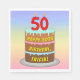 This cheerful and fun birthday-themed paper napkin design features a cartoon-style depiction of a three-tier birthday cake having number-shaped candles on top showing the age “50“, along with the message “HAPPY 50TH BIRTHDAY,”, and an editable recipient name. The background has a multicolored pastel rainbow spectrum inspired gradient pattern. Paper napkins like these might be used at a party for somebody who is celebrating their fiftieth birthday. [~Z0000623]