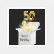 Gold balloons with sparkles and ribbons in a white box on black background for 50th birthday party.