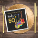 Personalised name in gold modern typography Rocks 50 fun psychedelic guitars and music 50th birthday party napkins with three cool colourful watercolor electric guitar, acoustic guitar and semi acoustic guitar designs on black background. Easy to use template to customise the age and name creating the perfect party cup to celebrate fifty in rock n roll style, ideal for a guitarist, musician and music lovers. This cool modern musical instrument design celebrates the music energy of this wonderful musical instrument and is the perfect way to rock a fiftieth birthday celebration. Original artwork by artist Catherine Sweetman