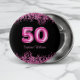 Make a stylish statement with this modern and glamourous button (badge) designed to commemorate a 50th birthday. The design showcases a captivating combination of pink and black, exuding an air of sophistication and elegance. The number 50 takes centre stage, elegantly written in a vibrant hot pink balloon-style font, capturing the essence of the milestone celebration. Against a sleek black background, elegant pink sparkly faux glitter effects gracefully adorn the top and bottom of the design, adding a touch of enchantment. The name of the birthday celebrant is beautifully presented in a contemporary pink-coloured hand-lettered style script, creating a personalised touch. Embrace the option to personalise and add the name of the birthday celebrant, transforming this button badge into a cherished keepsake that perfectly captures the modern, stylish, and glamourous spirit of this milestone occasion."