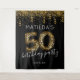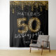 Fun 50th birthday party photo booth backdrop featuring a trendy black background, gold glitter and confetti, 50 leopard print hellium balloons, the birthday girl/boys name, and date.