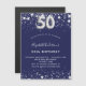 A modern, stylish and glamourous invitation for a 50th birthday party. A navy blue background, decorated with faux silver stars. Personalise and add your name and party details. Number 50 is written with a balloon style font.