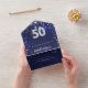A navy blue background, decorated with stars. The blue colour is uneven.  Personalise and add name, party details, RSVP date, return address and name.  Number 50 is written with a balloon style font.