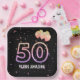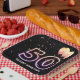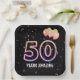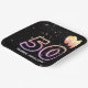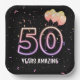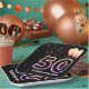 Party balloons and confetti on black background with the neon number 50 for a 50th birthday party.