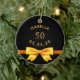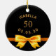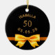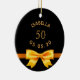 Elegant, classic, glamourous and feminine. A faux gold coloured bow and a ribbon, a bit of bling and luxury for a 50th birthday party decor, favour, keepsake or as a gift. Black background. Template for a name, age 50 and a date. Date of birth or date of the party. Golden letters and curved text.