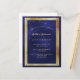 A trendy, modern 50th birthday party invitation card for men, guys, male. A dark blue, navy blue background. The blue colour is uneven. With a faux gold frame and golden confetti sprinkle, golden coloured letters. Templates for your party information.