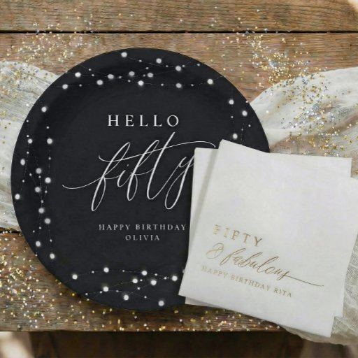 Celebrate turning fifty in unforgettable style with this chic Fifty & Fabulous 50th birthday invitation. Designed in a modern black and white palette, this elegant invitation features graceful script typography paired with softly glowing string lights for a classy, upscale look. The clean layout keeps the design simple and refined, making it perfect for an adult milestone celebration with timeless appeal.