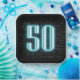 Glowing aqua neon sign on dark brick background for a 50th birthday party.