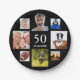 A paper plate for a 50 birthday party for a man, guy, celebrating his life with a collage of 8 of your own photos. Templates the age 50 and a date. Date of birth or the date of the party. White coloured letters. Black background.