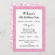 Send customised pink and white birthday party invitations to celebrate the 50th birthday of someone special. The 50th birthday party theme on back is a random number pattern of the pink milestone number 50 randomly scattered on a white background. The front has text templates for; Who, What, Where, and RSVP, framed with the same pattern as the back, with the colours reversed.