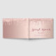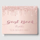 A guest book for a girly and glamourous 50th birthday party. A faux rose gold background with an elegant faux rose gold glitter drips, paint drip look. The text: The name and the title: Guest Book are written in dark rose gold with a modern hand lettered style script. Tempate for a date and age 50.