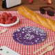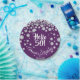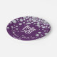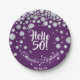 An elegant and glamourous paper plate for a 50th birthday party for a girl. A chic purple coloured background. A purple coloured circle with modern hand lettered style text: Hello 50! Faux diamonds as decoration. Template for a name and a date.