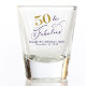 Elegant and chic 50th birthday party shot glass. "50 & Fabulous" is written in a a stylish gold and purple script and you can personalise with your name and the party date.